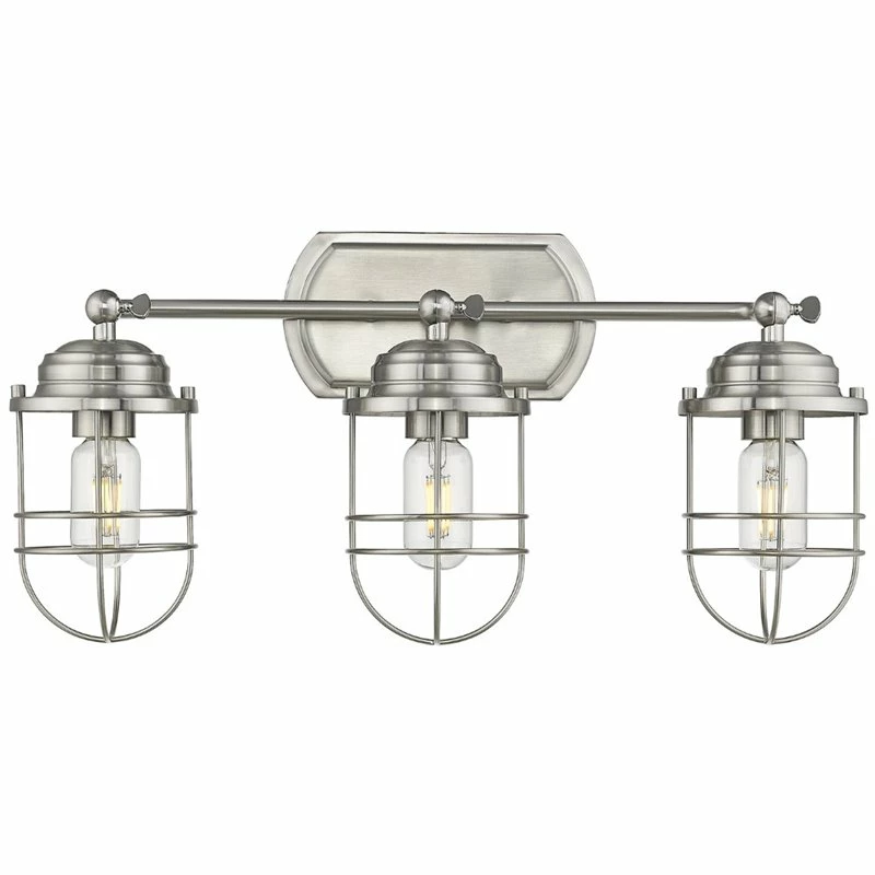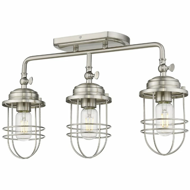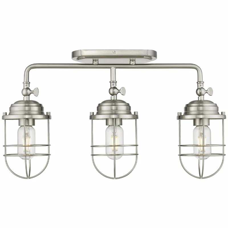 Nautical-inspired design of industrial fixture to create your seaside retreat. The New England style is enhanced by protective cages that shield the otherwise exposed bulbs. Created to suit the needs of many, swivel canopies allow the fixture to be mounted on sloped ceilings. Ball joints permit a multitude of configurations. Point all of the metal shades down for directional task lighting or angle them out to fit a low ceiling or tight space. This 3-light track light is damp rated and may be mounted on the wall or ceiling.