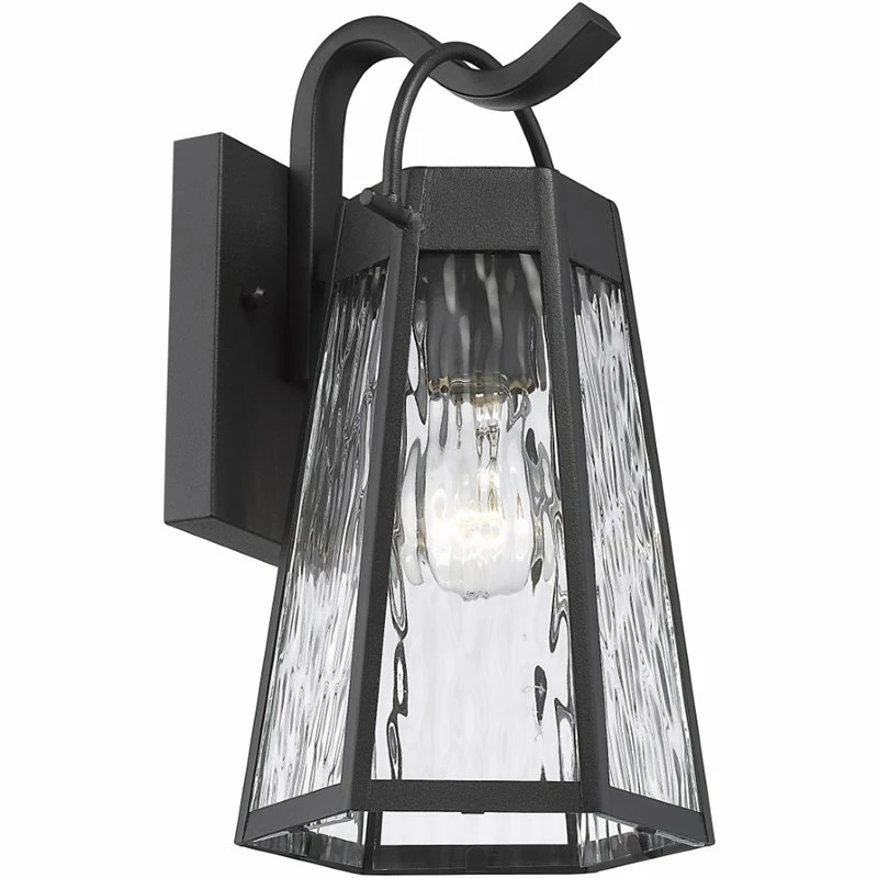 ALEXA, an Industrial style 1 light outdoor wall sconce features a textured black finish. The clean lines of the steel frame adds interest while the water style glass and cage provides ample light to your outdoor decor.