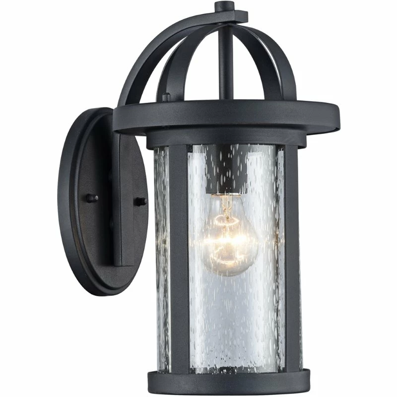 This 1-light outdoor wall sconce features a textured black finish that will complement many transitional decors. The clear seedy glass cylinder allows the light to bounce in different ways and creates a warm welcoming glow to the outside of your home.