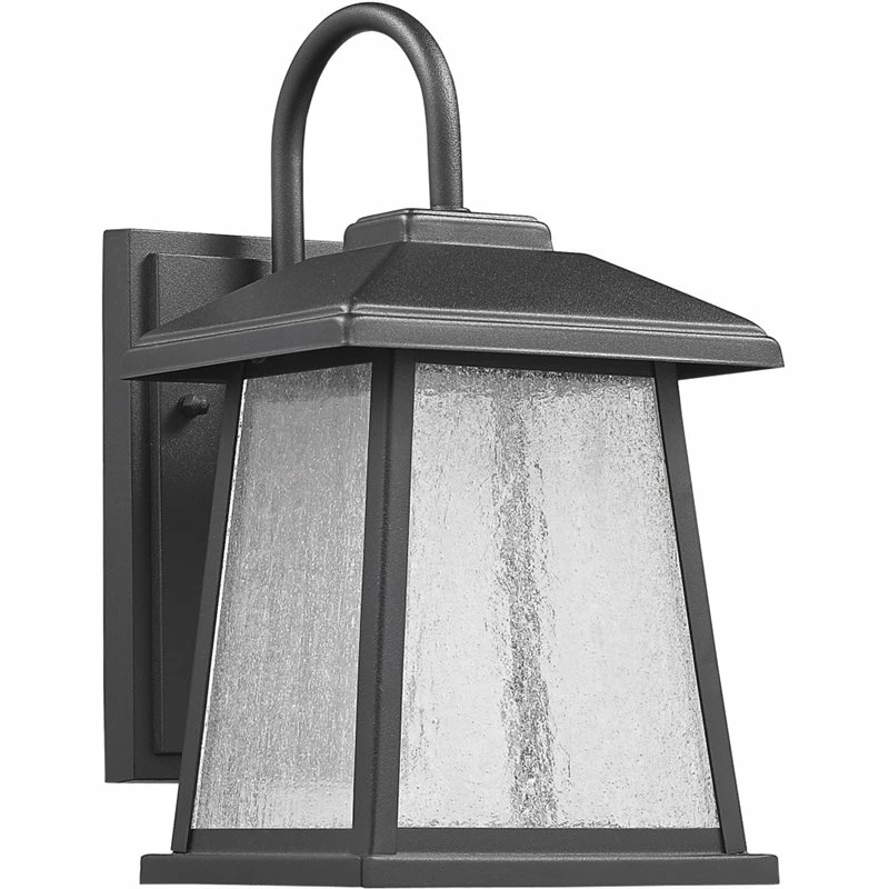 This transitional LED outdoor wall lantern features a textured black finish that will create a warm welcoming feeling to the exterior of your home. The clear seedy glass panels add interest to complete the look of this piece.