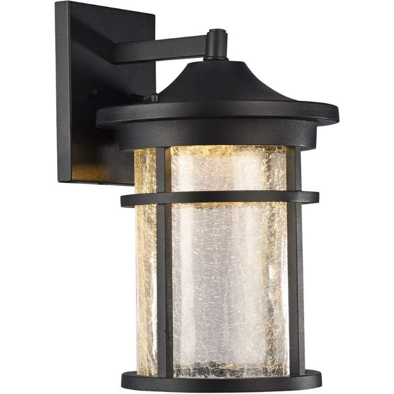 This transitional LED outdoor wall lantern features a textured black finish that will complement many traditional or transitional decors. The crackle glass cylinder add interest and create a warm welcoming glow to the outside of your home. The light output of the 9 watt LED bulb is equivalent to a 75 watt incandescent bulb and will last as much as 10 times longer.