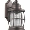 This transitional 1-light outdoor wall light features a painted black finish that will compliment many outdoor decors. The clear seedy glass adds interest to the look and the open bottom makes changing bulbs easy. Steel construction.