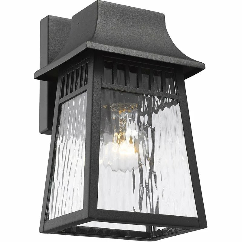 GRANT, a Transitional style 1 light outdoor wall sconce features a textured black finish. The clean lines of the steel frame adds interest while the water style glass and cage provides ample light to your outdoor decor.