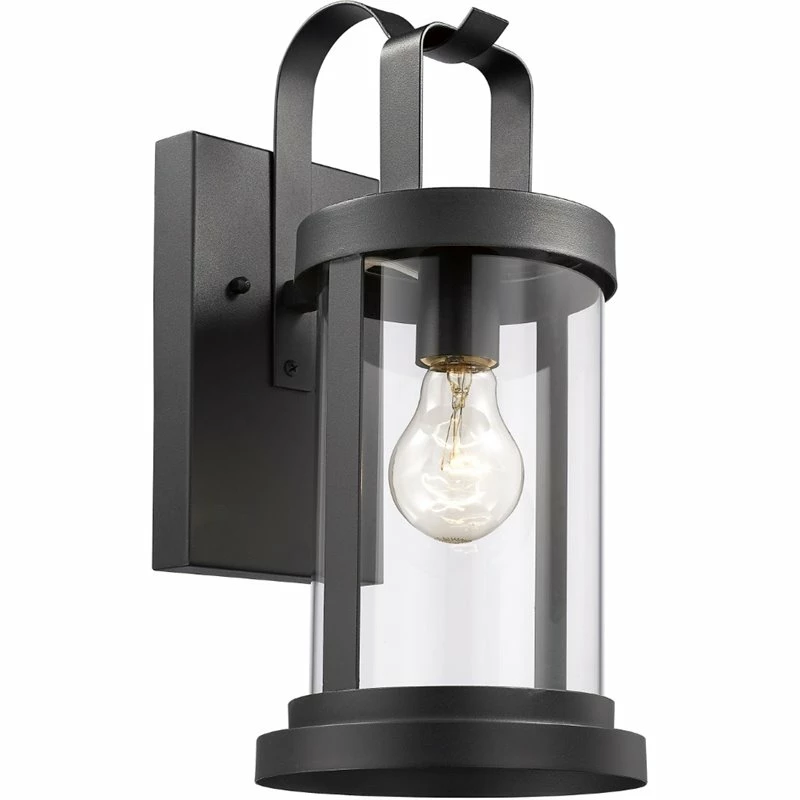 KASH, a Transitional style 1 light outdoor wall sconce features a textured black finish. The clean lines of the steel frame adds interest while the clear glass and cage provides ample light to your outdoor decor.