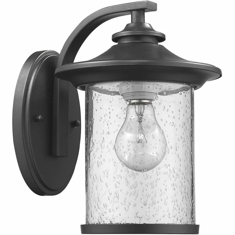 This transitional 1-light outdoor wall light features a painted black finish that will compliment many outdoor decors. The clear seedy glass adds interest to the look and the open bottom makes changing bulbs easy.