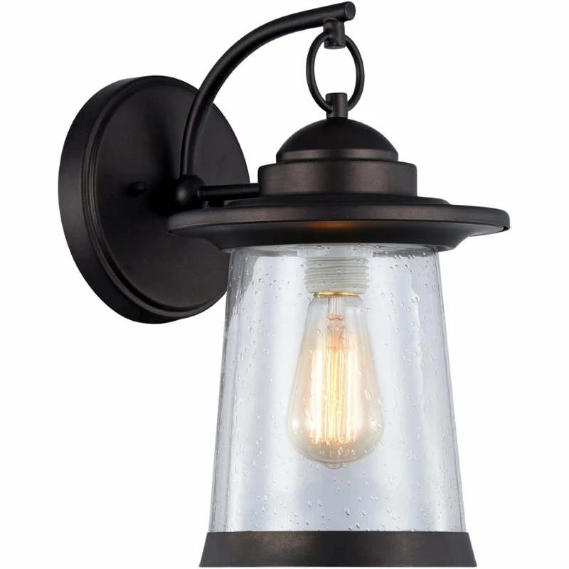 This 1-light outdoor wall sconce features a oil rubbed bronze finish that will complement many transitional decors. The clear seedy glass shade allows the light to bounce in different ways and creates a warm welcoming glow to the outside of your home.
