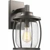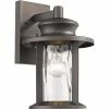 This 1-light outdoor wall lantern features a textured black finish that will complement many transitional decors. The clean lines of the steel frame adds interest while the clear water glass gives the light a whole new look for your outdoor decor.