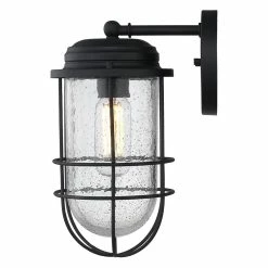Nautical-inspired, Seaport is a collection of industrial fixtures to create your seaside retreat. Offered in a textured natural black, the New England style is enhanced by protective cages and seeded glass that shield the fixture’s bulbs. This outdoor fixture is wet rated and is UV-coated to protect it from fading.
