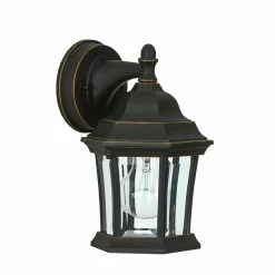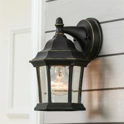 This wall lantern sconce offers a traditional style for a variety of exteriors. The sconce is powered by electricity, and requires hardwiring using the instructions provided. The aluminum frame has a black finish with gold highlights, and the body of the lantern features a clear glass to allow for a brightly lit selected outdoor area. Add this beauty to your porch, patio, or any outdoor wall where you need extra light.