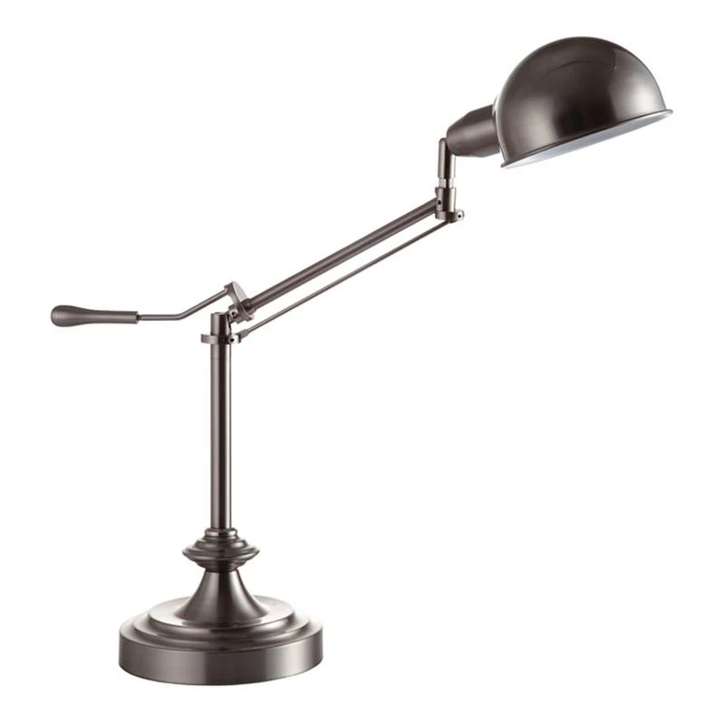 The Perch Swing Arm Task Desk Lamp lends a functional retro look in Brushed aged silver finish. Multiple adjustments can be made for height and arm extension placement to customize your personal lighting effect. A practical design for craft spaces, workrooms, the office, or your favorite reading area. Features a 45-degree arm rotation and a 90-degree head rotation. On/off switch cord. UL listed and CFL compatible. Bulb is not included. Shade measures 6 x 6 x 3.5 in. Uses one 60-watt type A bulb. Base measures 7.25 inches in diameter. Height Adjustable from 18.5 inches to 24.5 inches.