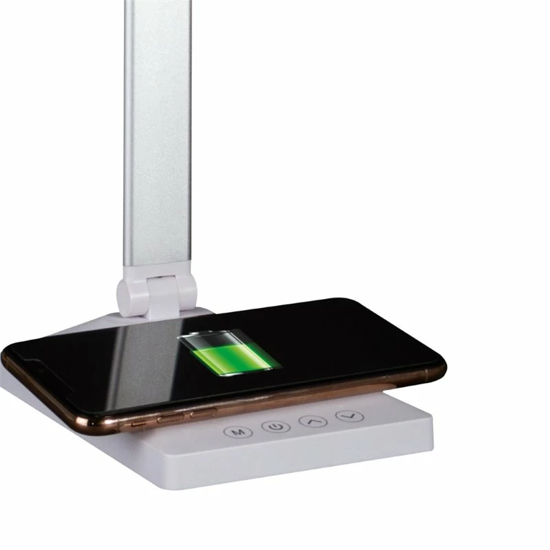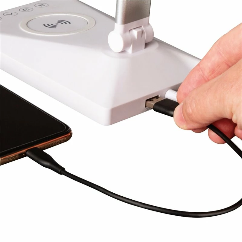 Give your space a total lighting upgrade with the OttLite Entice LED Desk Lamp with Wireless Charging. Part of the OttLite Wellness Series, this feature-packed folding lamp helps reduce eyestrain with next generation ClearSun LED technology – as close to natural daylight as you can get. The Entice also includes two additional color temperature modes (warm white and bright white). Easily adjust the brightness with the up and down buttons. With two points of articulation on the sleek aluminum arm, you can easily place the soothing, low glare illumination right where you need it. And, to keep your devices fully charged use the Qi-wireless charging pad or the 5V, 2.1A USB port.
