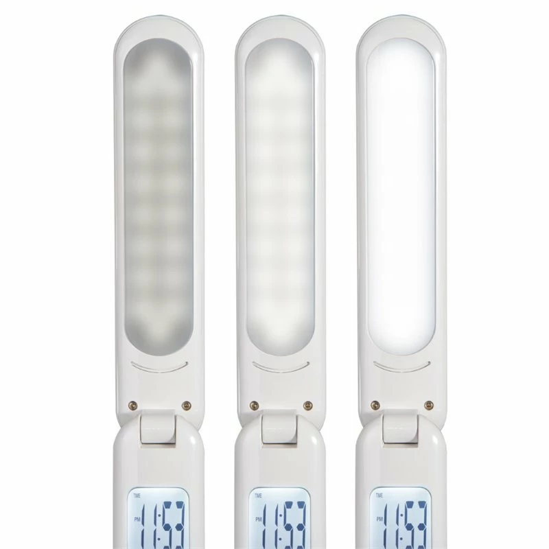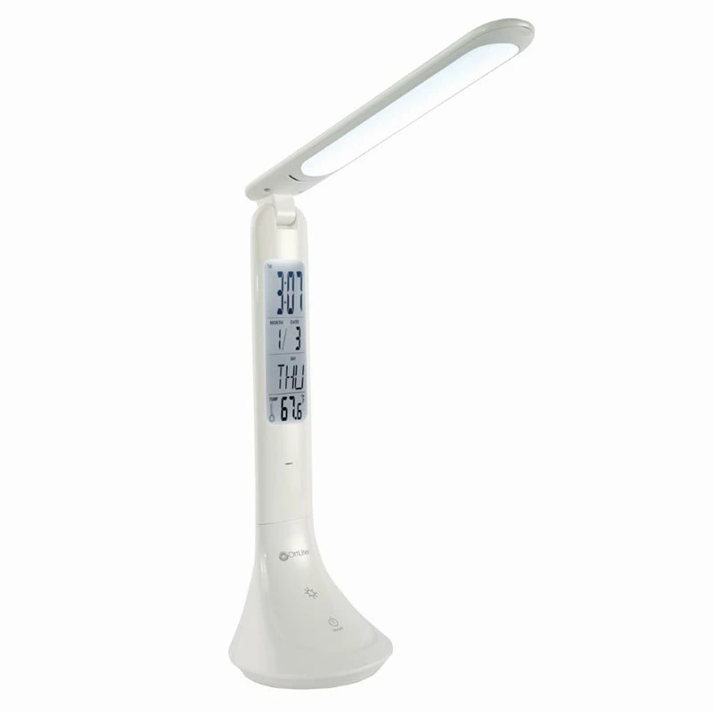 Bring healthy natural lighting everywhere you go! The OttLite Travel Rechargeable LED Desk Lamp features OttLite’s exclusive ClearSun® LED technology – developed to reduce eyestrain by up to 51%. Great for airplanes, the coffee shop or your coffee table, easily charge with your laptop via the included USB charging cable. Stay on track with the backlit digital display that shows time, date, month, day of the week and temperature. The compact design folds down to fit in your laptop bag or bookbag, but then opens up so you can adjust height from 10.75 to 15 inches. Control the ClearSun natural daylight LEDs with a touch of a finger and choose from three brightness settings.