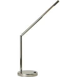 The austere angles of this modern task lamp offer elevated desktop lighting design for the well-organized workspace. A decorative light fixture for the décor minimalist, the round lamp base supports a stem and adjustable neck that conceals a single bulb on the underside of the rod. A shiny polished nickel finish makes the table lamp outshine its slender silhouette.